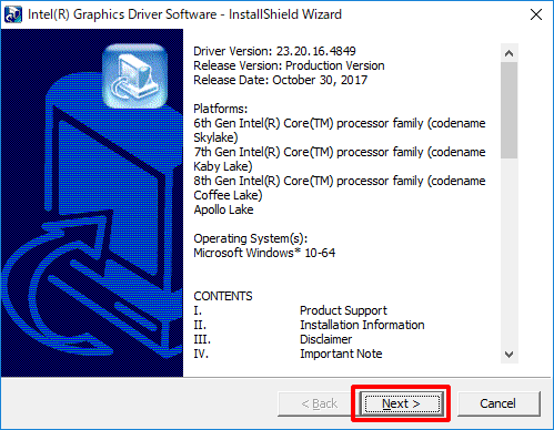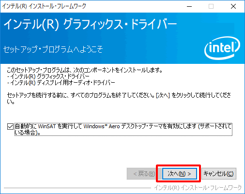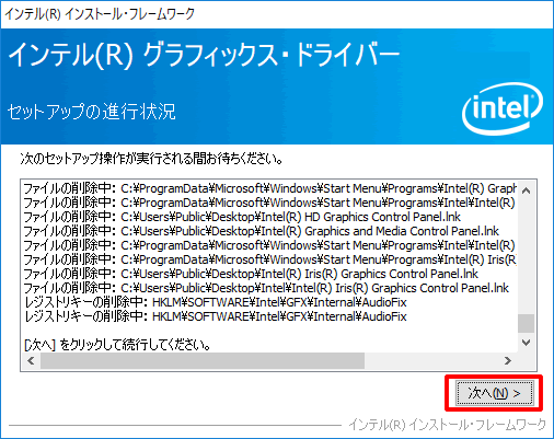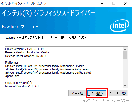 3.「Intel(R) Graphics Driver Software」画面が表示されるので、[Next]をクリックします。