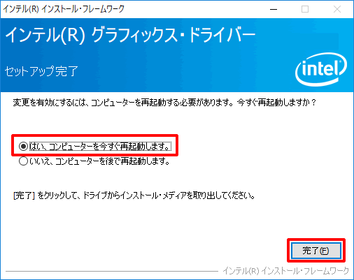 8.「セットアップ完了」と表示されるので、[はい、コンピューターを今すぐ再起動します。」を選択して、[完了]をクリックします。